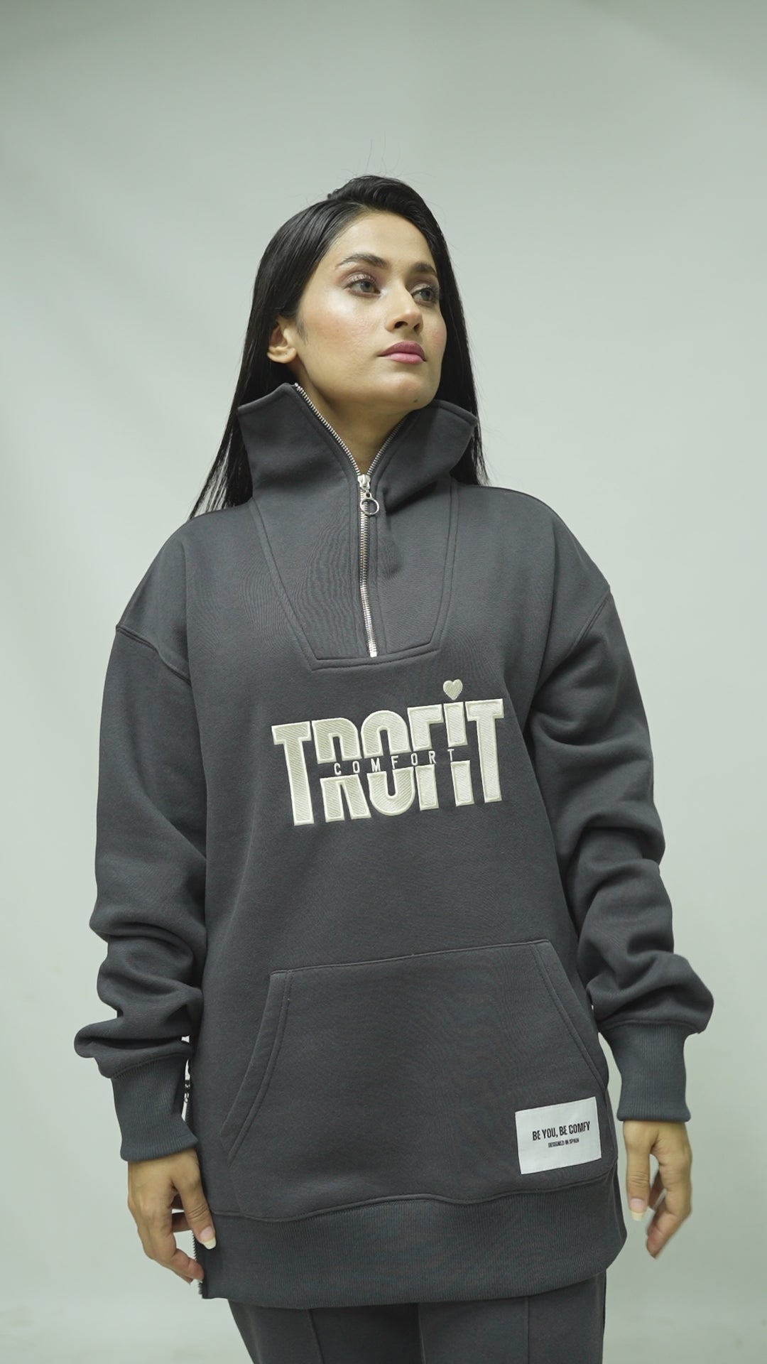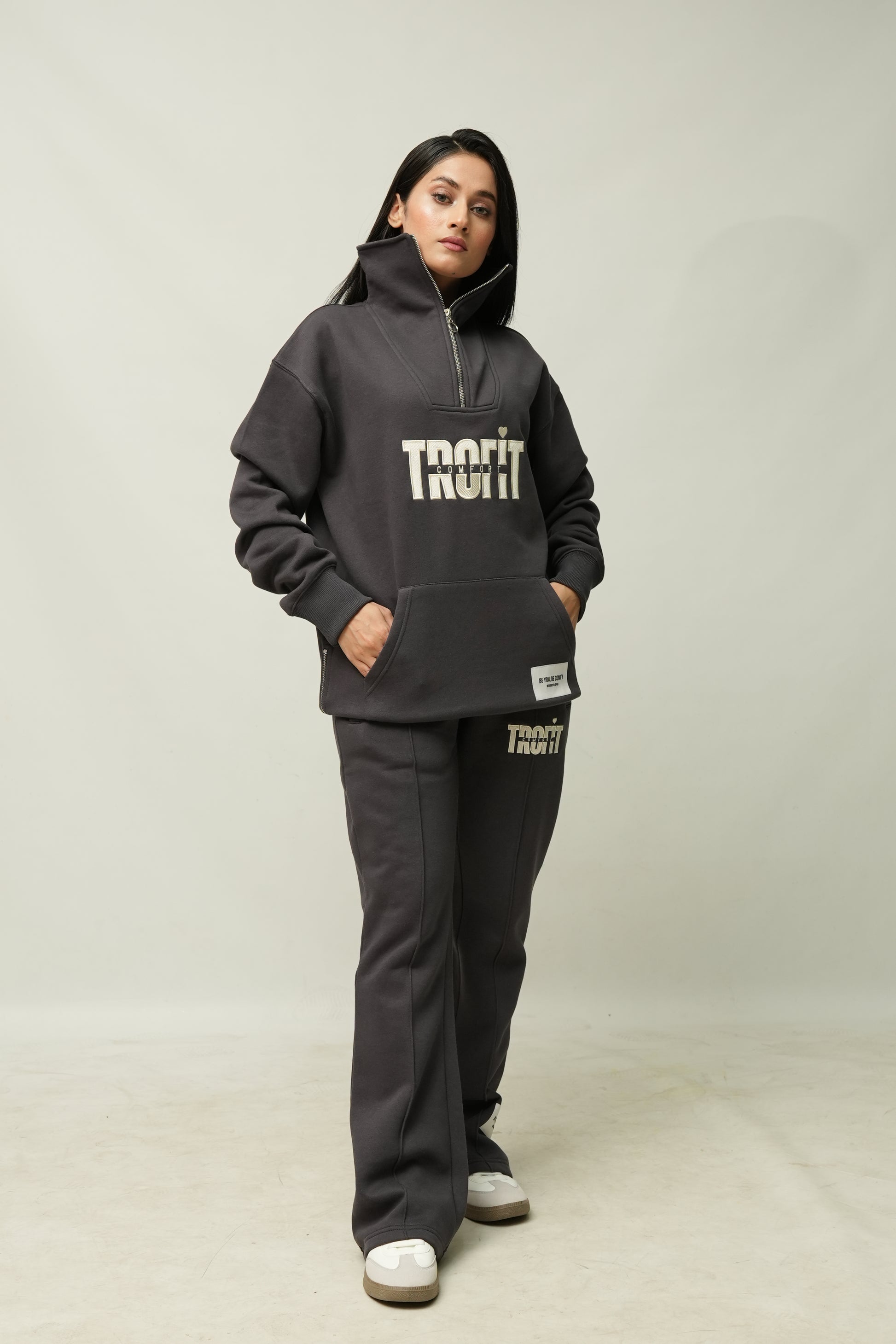 Este conjunto deportivo de alta calidad, una combinación atemporal de elegancia y comodidad, está confeccionado con un tejido de 80% algodón y 20% poliéster de primera calidad, que garantiza suavidad y transpirabilidad. Diseñado para un ajuste cómodo y discreto, presenta un cuello alto con cierre de cremallera de 1/3, cremalleras laterales discretas y un amplio bolsillo tipo canguro para mayor funcionalidad. El pantalón acampanado añade un toque de sofisticación a la vez que permite una gran libertad de movimiento, convirtiendo este conjunto en una prenda esencial y versátil para el día a día.
